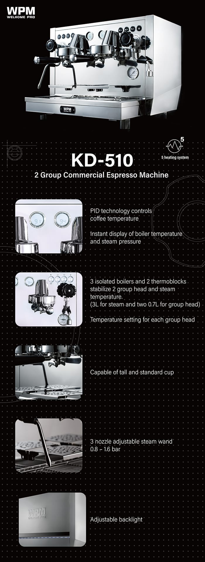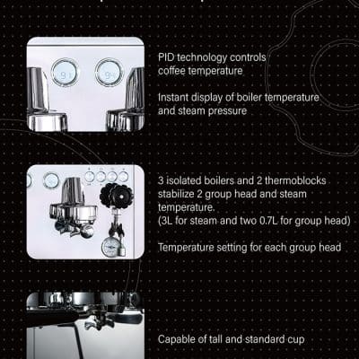 Máy pha cà phê chuyên nghiệp WELHOME KDS 510 là dòng máy 2 group đầu tiên mà thương hiệu WELHOME nổi tiếng giá rẻ cho ra đời, cấu trúc mạnh với 3 boilers, 2 thermocouples để chiết suất cà phê luôn ổn định, hương vị cà phê luôn đảm bảo chất lượng đầu ra tương đương nhau.